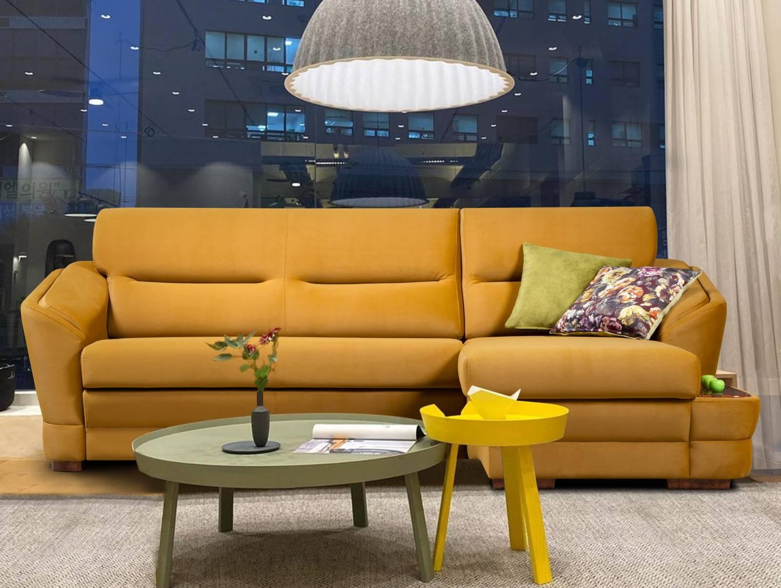 Комфортность дивану придают широкие подлокотники оригинальной формы и спинка , состоящая из двух горизонтальных валиков, разных по мягкости. Особая эстетика достигается за счёт декоративных отстрочек. Вдоль углового сегмента, в продолжение подлокотника, размещается ламинированная полочка.